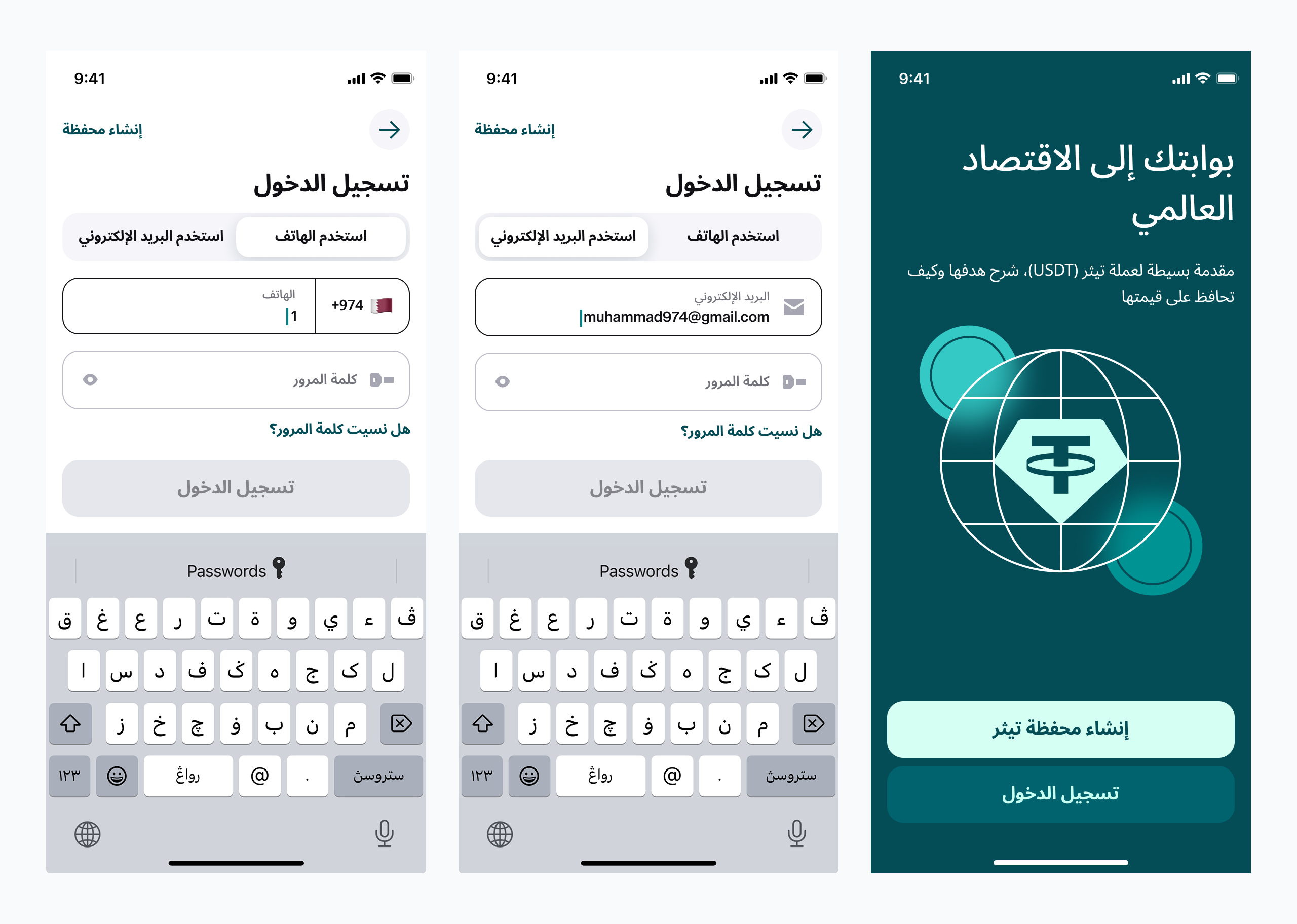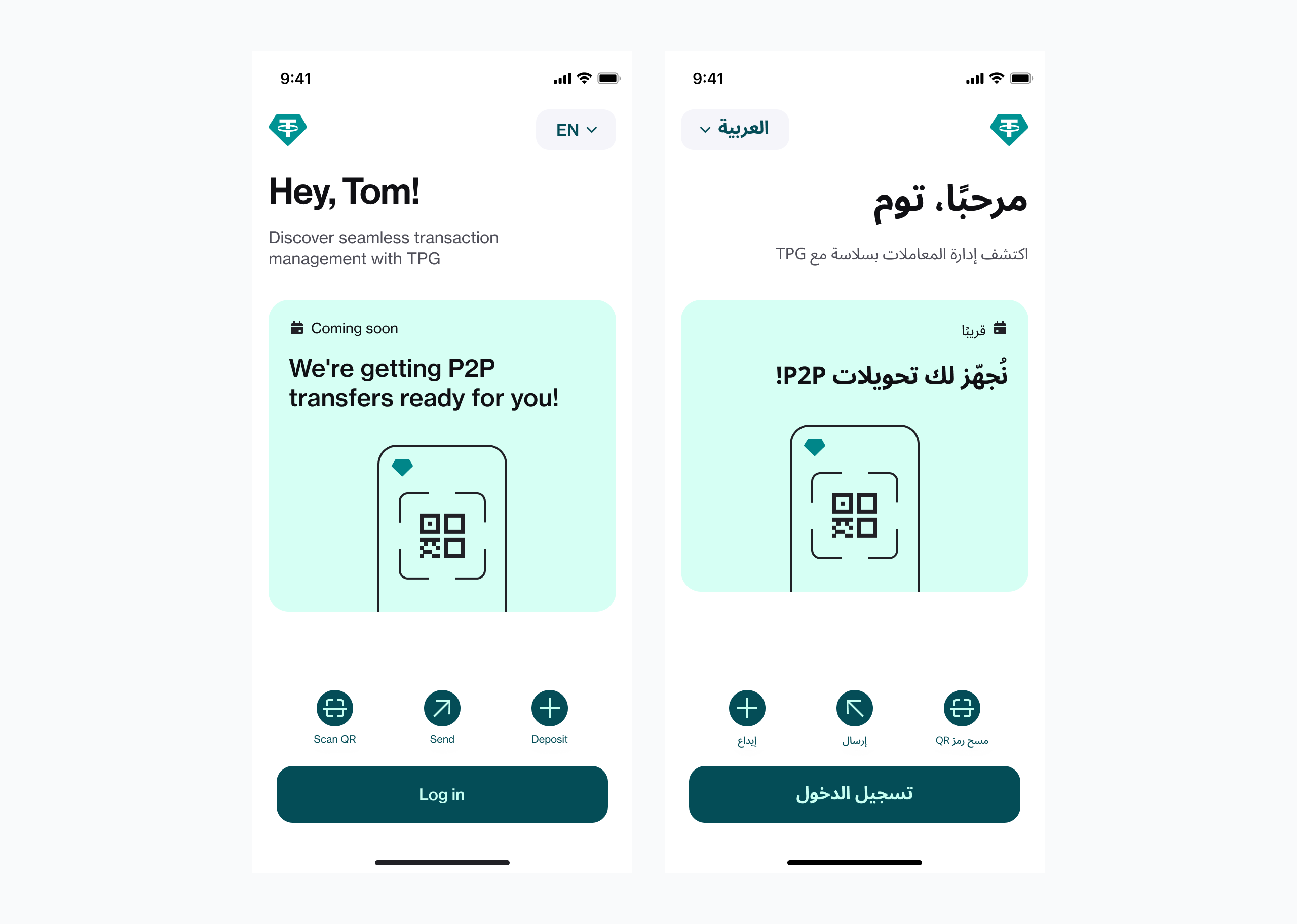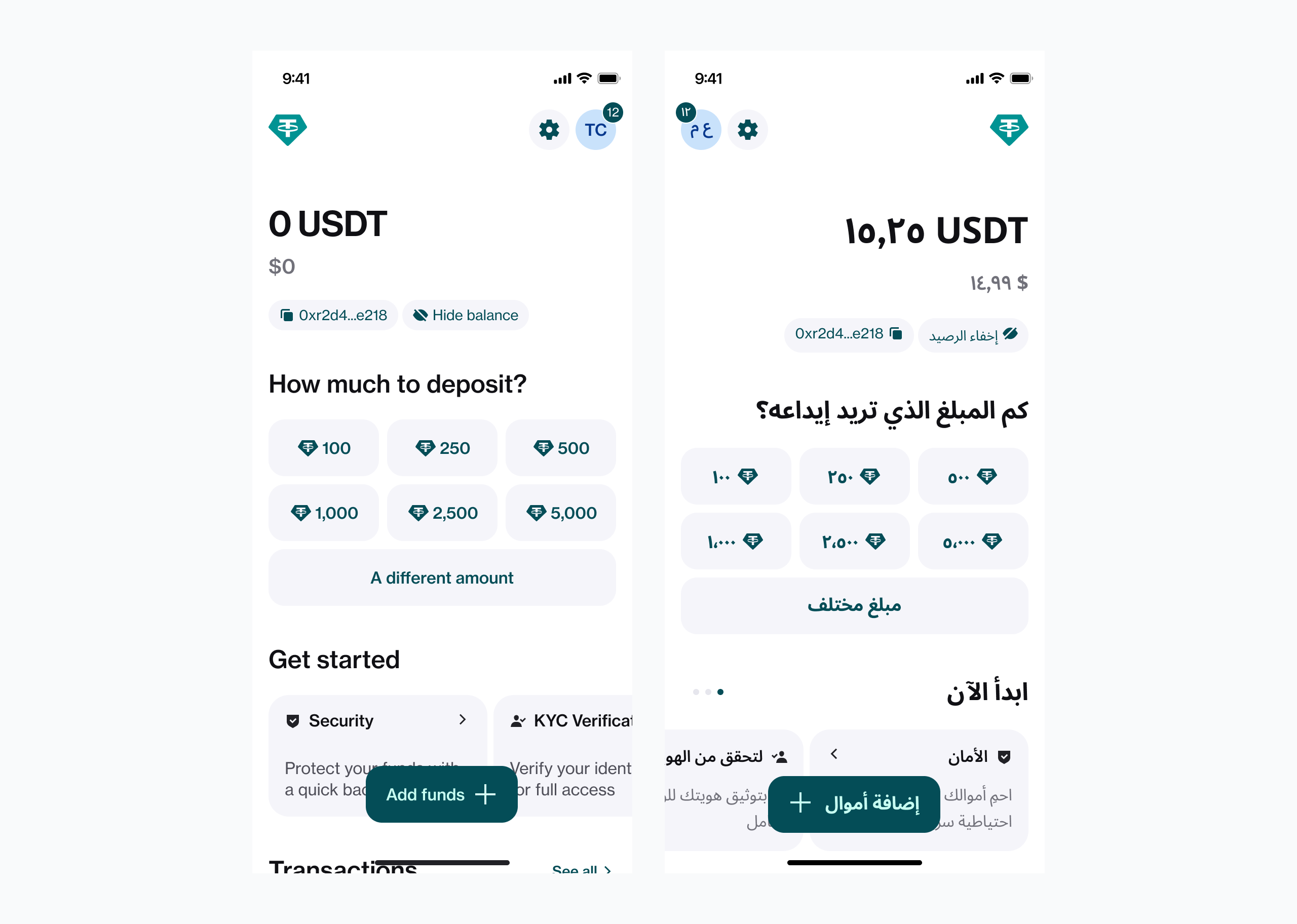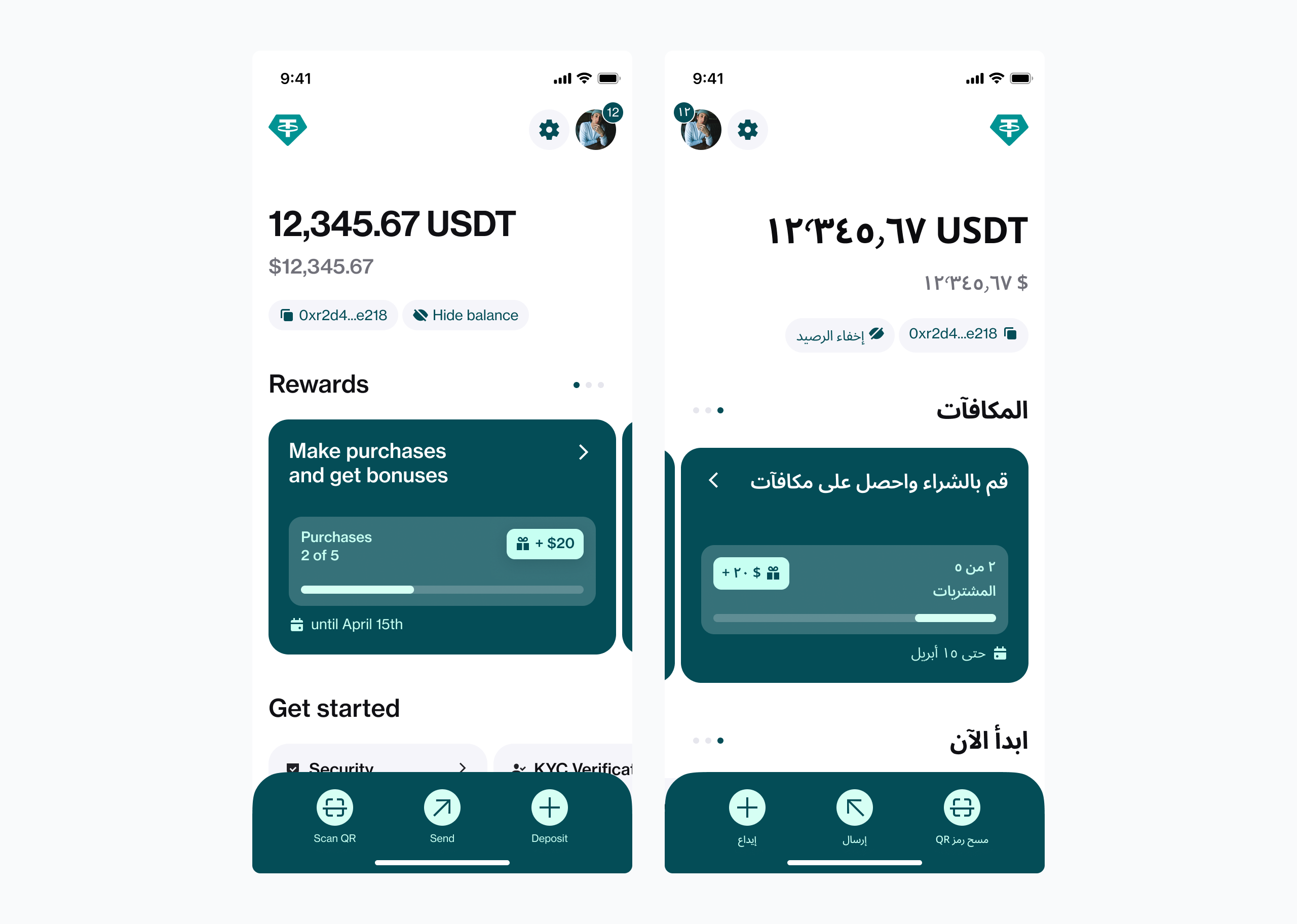 Designed to support Tether tokens, this payments app delivers a global experience with a local feel. It supports multiple languages, including right-to-left (RTL) scripts Arabic. The interface adapts to local reading directions, numerals, and symbols — ensuring intuitive, accessible use across regions.
