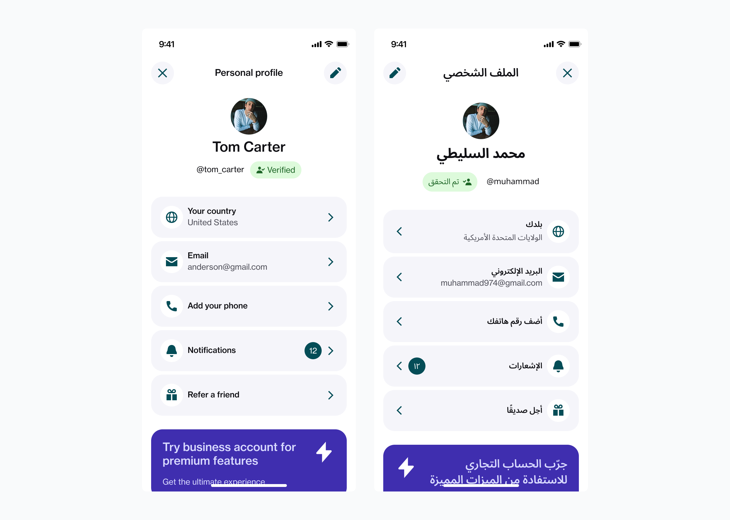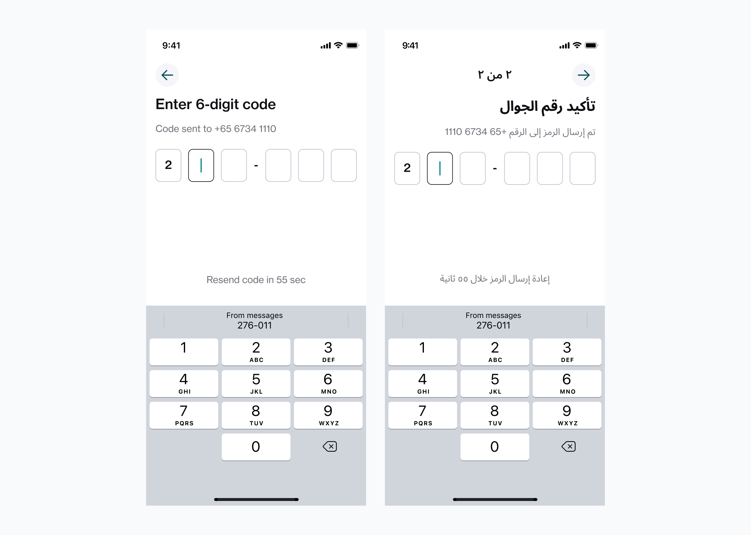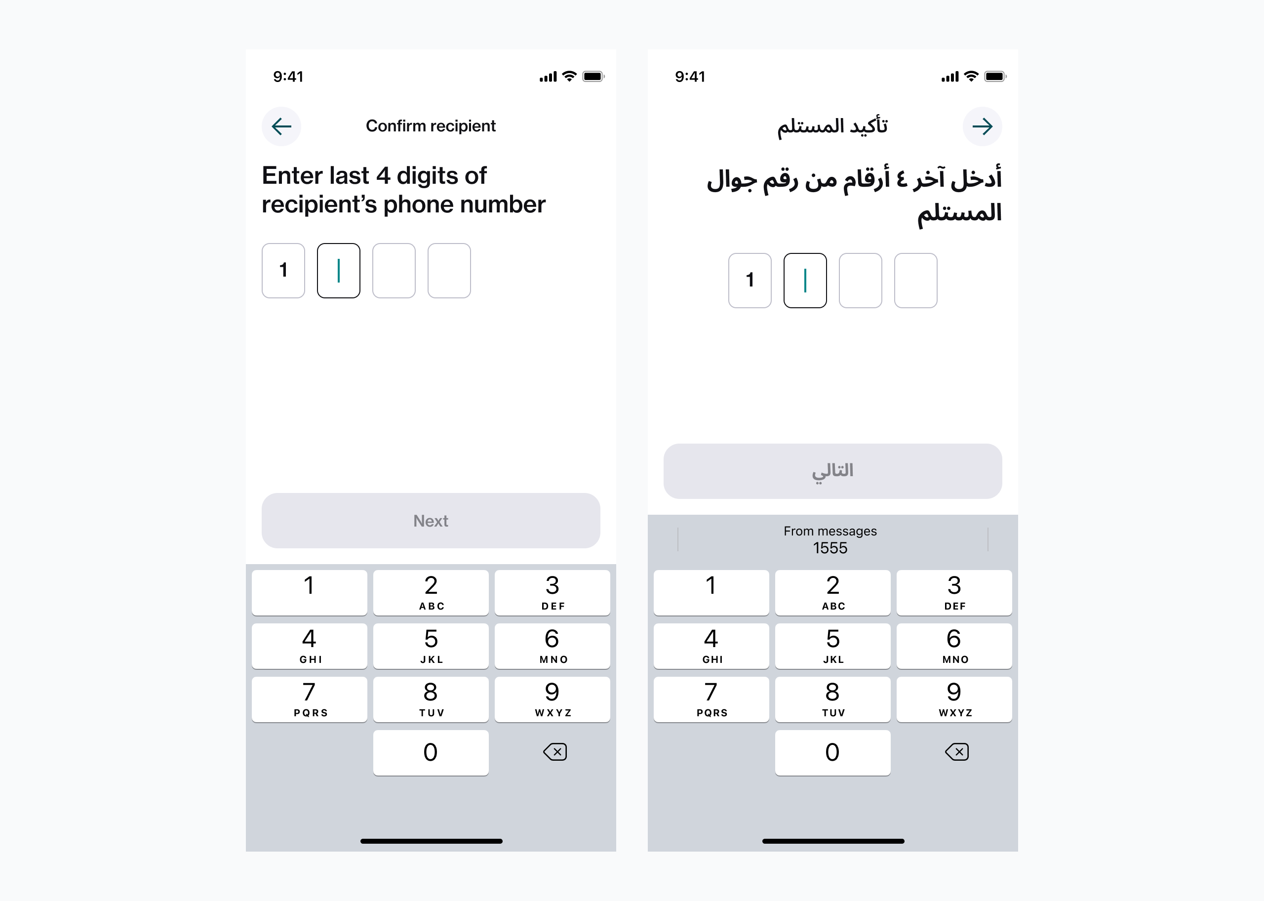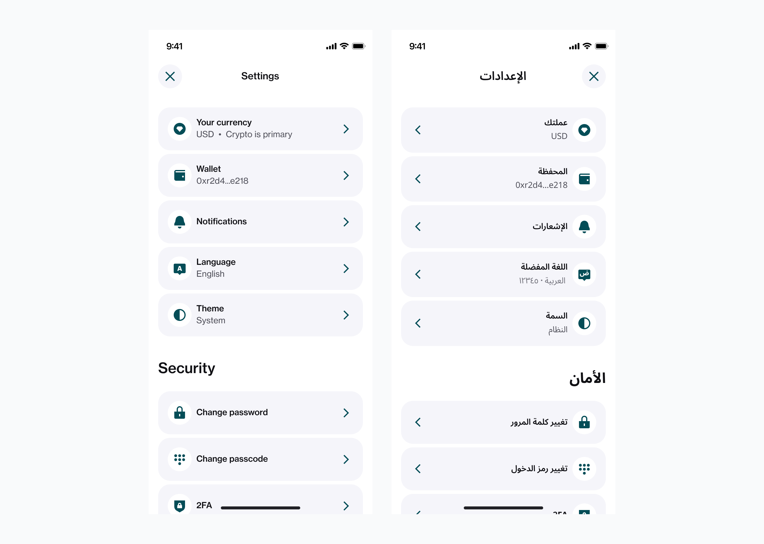 Right-to-left (RTL) support for Arabic requires more than just flipping the layout—regional differences in script, numerals, and formatting must be considered. For this app, the focus was on serving the most widely used Arabic locales, with specific attention to Eastern Arabic numerals. These are essential for financial applications, where clarity and accuracy in currency and number presentation are critical to user trust and usability.